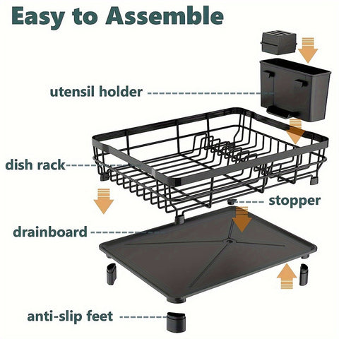 Multifunctional Rack: This washing up rack includes a utensil holder,plate drying rack, and draining board. Quick to set up with no tools required, it features silicone leg covers for stability and multiple compartments to organize your utensils efficiently