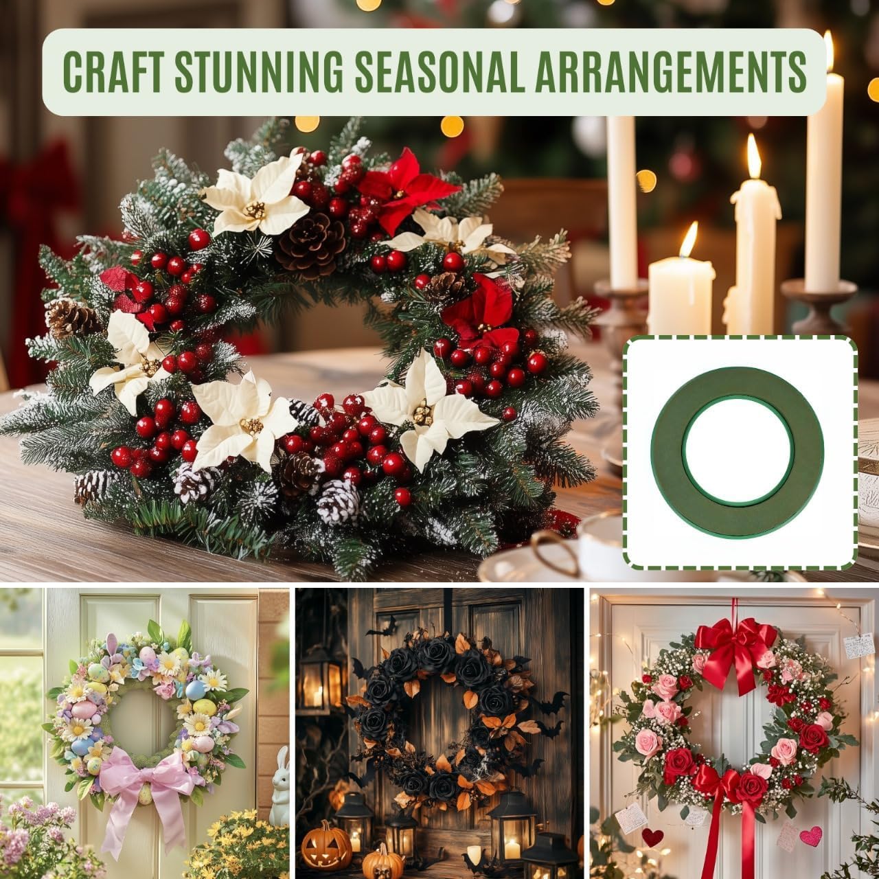 - ๐ท๐๐๐๐๐๐ ๐๐๐ ๐บ๐๐๐๐๐๐ ๐ถ๐๐๐๐๐๐๐๐ The 12-inch green round floral foam wreath ring is ideal for formal gatherings, birthdays, and special events. Its reliable base supports beautiful floral arrangements that will impress guests, adding elegance and charm to your celebrations.