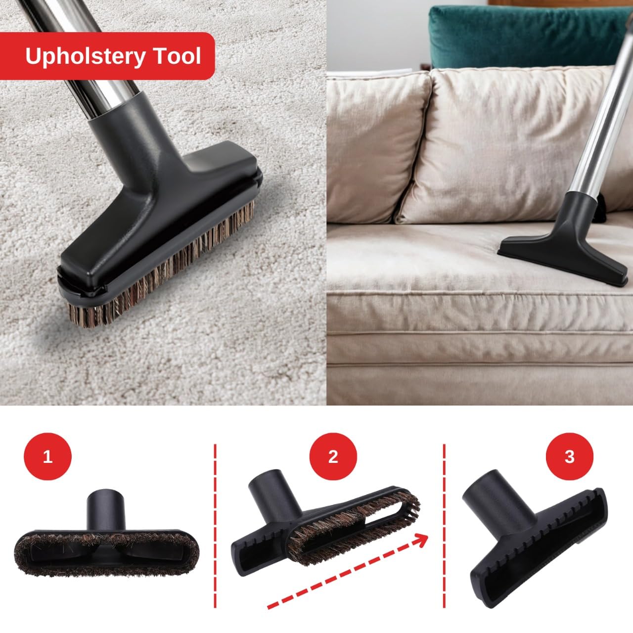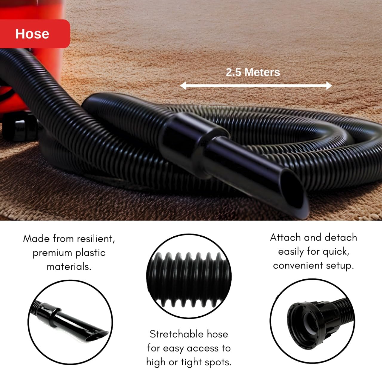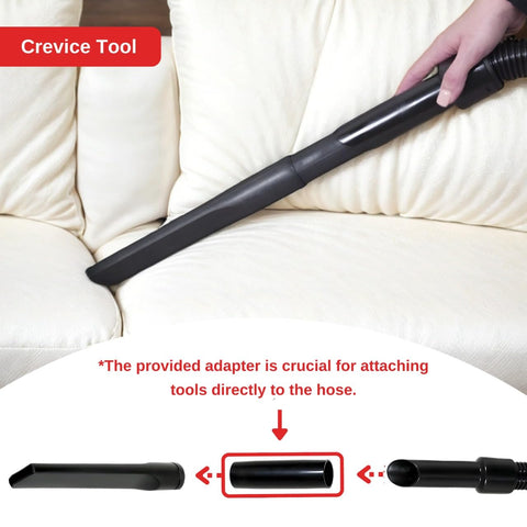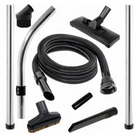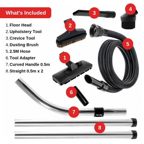 - 𝐊𝐢𝐭 𝐢𝐧𝐜𝐥𝐮𝐝𝐞𝐬: 2 x Chrome 0.5m long extension rods, 1 x chrome bent end handle with variable suction control (0.49m), 2.5 metre extra long hose with dual swivel cuff connectors (eliminates hose snag), 1 x combination hard floor & carpet head tool with retractable brushes (32mm diameter) 1 x stiff stair and upholstery tool brush (32mm diameter), 1 x round dusting brush (32mm diameter), 1 x slim crevice tool (32mm diameter), 1 x tool adaptor to enable hose attachment to mini tool
